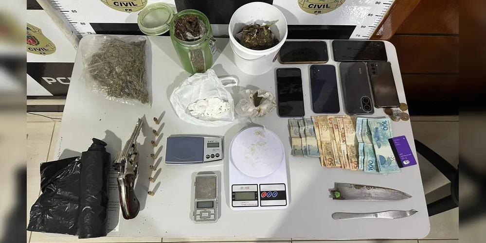 A Polícia Civil do Paraná (PCPR) prendeu dois jovens de 19 anos em flagrante durante o cumprimento de mandados de busca e apreensão em dois bairros de Irati, nesta sexta-feira (10). As ações aconteceram no Alto da Glória e no Rio Bonito. Os policiais encontraram um revólver calibre .38, munições, 650 gramas de maconha, haxixe, cocaína, balanças de precisão e um veículo usado para entregas de drogas.