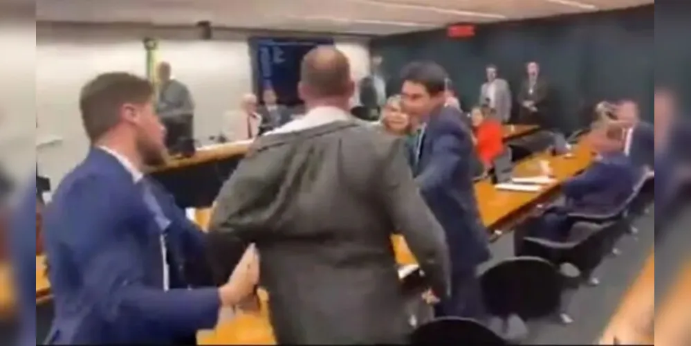 O microfone da comissão oficial não transmite a fala, mas Eduardo afirma que o deputado Macron disse que a facada foi “fake”. A partir daí. Eduardo se levanta e se dirige para onde estava o deputado petista. Os dois foram mantidos separados por colegas.