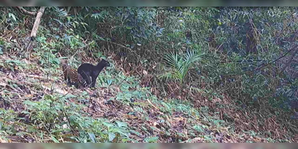 Monitoramento por câmeras em espaço conservado no Paraná captou em vídeo uma imagem da mãe, com coloração inteiramente negra, e seu filhote com a coloração comum da espécie, considerada em risco de extinção