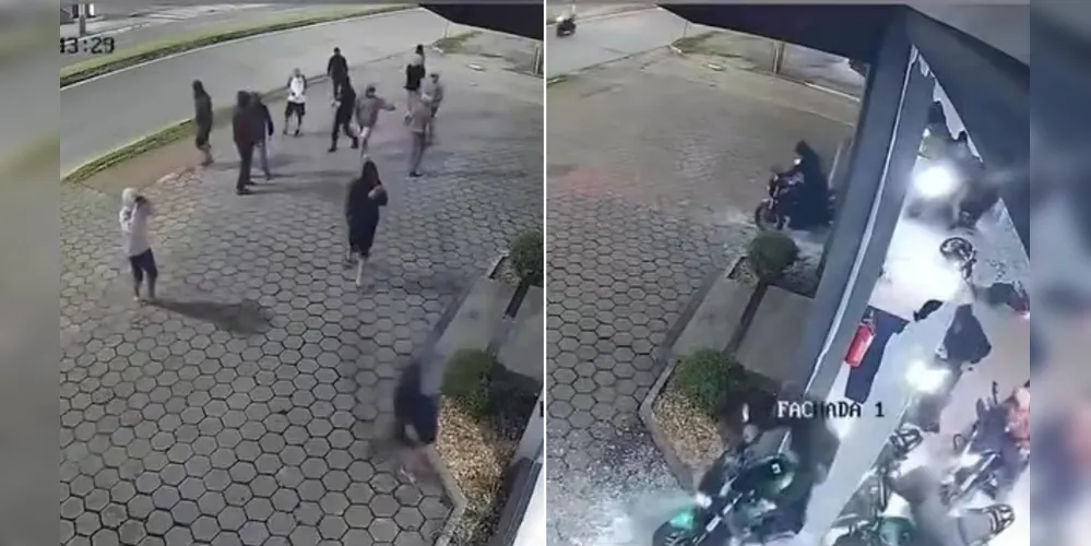 Nas imagens, é possível visualizar o grupo arremessando pedras contra a fachada do estabelecimento, mostrando também a forma desorganizada em que a invasão foi realizada. Eles fugiram com um total de 12 motocicletas.