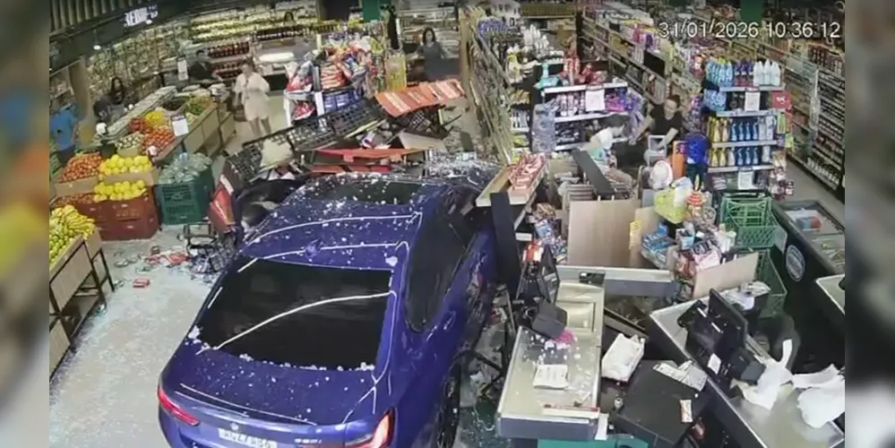Um detalhe tem chamado a atenção nas imagens registradas por uma das câmeras de segurança do supermercado invadido por uma BMW, na manhã deste sábado (31), no Centro de Cascavel: às 10h36m13s, é possível ver quando a condutora do veículo, que alegou ter confundido os pedais do carro automático, sai imediatamente pela porta do motorista com o celular na mão esquerda.