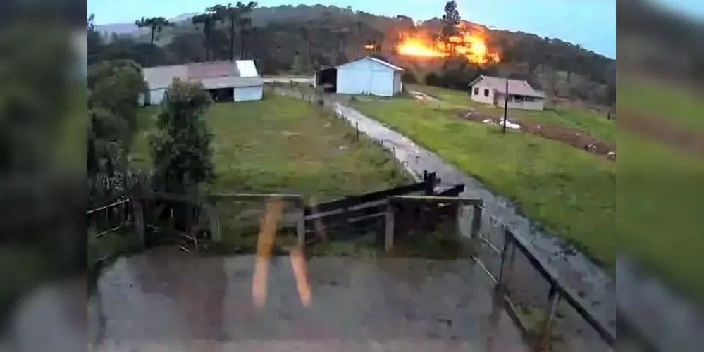 A câmera de segurança de uma propriedade vizinha flagrou o momento em que o raio atingiu uma cerca elétrica, que imediatamente começou a pegar fogo. O caso aconteceu por volta das 19h e chovia fraco no momento.