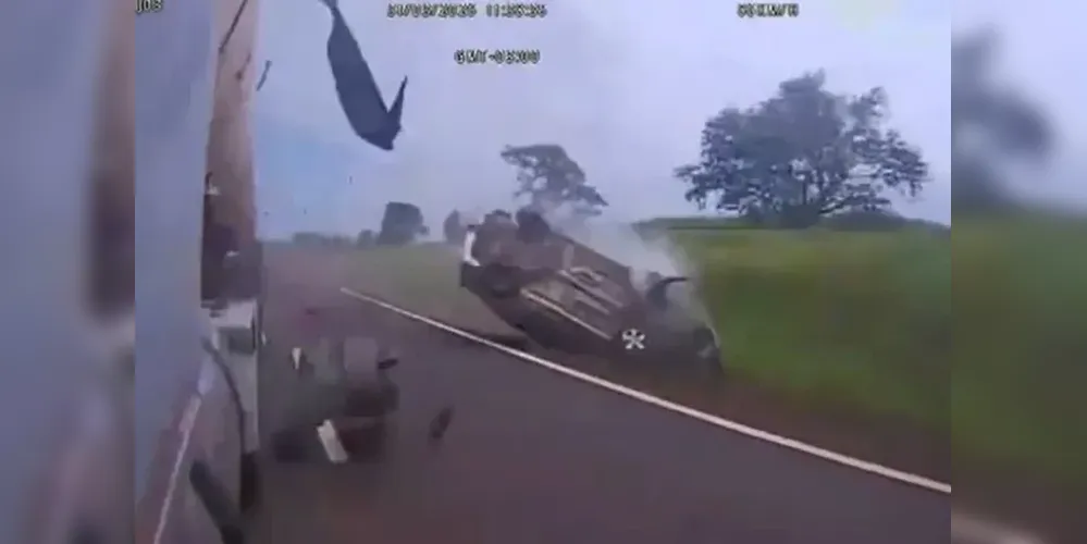 Após bater no caminhão em alta velocidade, o carro perdeu o contato com o chão e capotou ao menos quatro vezes antes de parar. A câmera também mostra o momento em que o caminhoneiro desembarca e caminha até a traseira do veículo.
