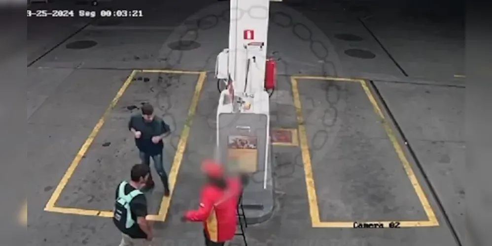 As imagens mostram o que é descrito por Sena. Primeiramente, é possível notar a dupla em uma moto. Em um segundo momento, ambos se aproximam do frentista negro e, em seguida, um deles o atinge com a cabeçada.
