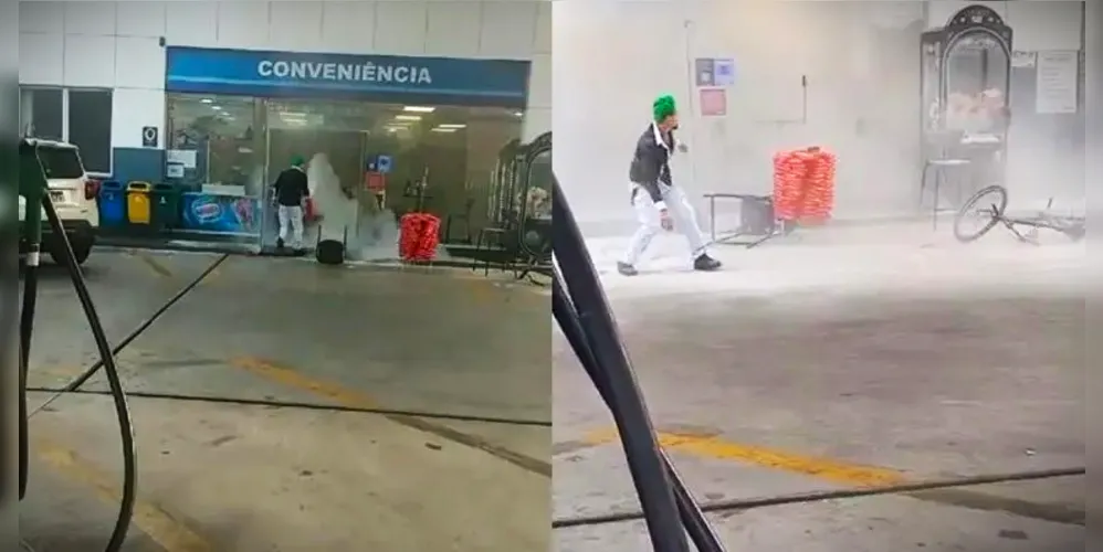 Vídeos registrados no local mostram o jovem arremessando objetos contra a loja de conveniências e despejando um agente extintor de fogo. Ele também foi visto quebrando vidros do local com o extintor.