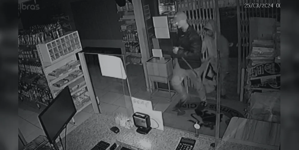 Nas imagens é possível ver dois homens; um deles abre a porta utilizando um 'pé de cabra' e em seguida eles entram no estabelecimento. Enquanto um deles furta o caixa do local, o outro coloca itens dentro de uma mochila.
