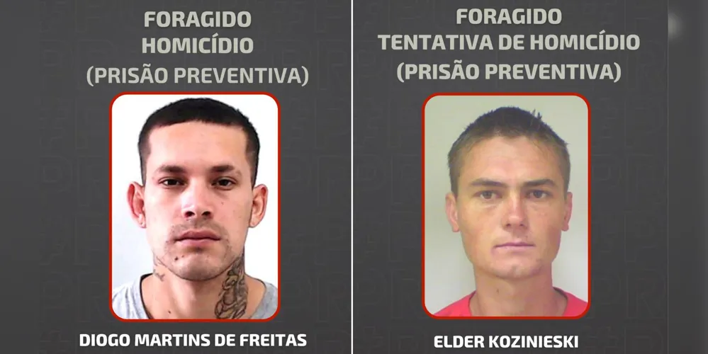 A Polícia Civil do Paraná (PCPR) divulgou nesta quarta-feira (4) as fotos de dois homens foragidos pela prática de dois homicídios distintos registrados em Ponta Grossa, na região dos Campos Gerais.