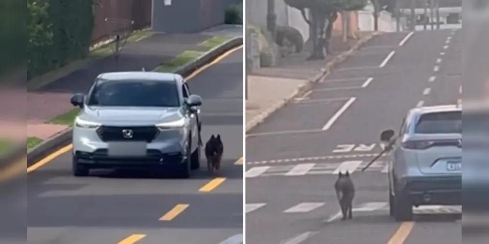 Um homem foi flagrado dirigindo pelas ruas de Ponta Grossa com o cachorro preso na coleira do lado de fora do carro. O animal foi forçado a acompanhar o trajeto no trânsito, exposto a risco de atropelamento, exaustão e ferimentos. A situação foi registrada em dois dias diferentes pela vereadora Teka dos Animais.