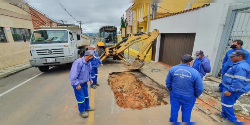 O asfalto cedeu e um grande buraco bloqueou uma das vias da rua Padre João Lux, no centro de Ponta Grossa. Assista no Portal #aRede