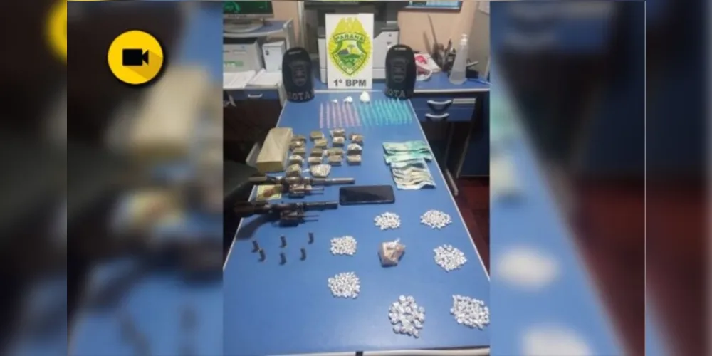 Em buscas no local da abordagem foram localizados 142g de cocaína, 105gr de crack, 856gr de maconha, além de dois revolveres cal.38, seis munições, certa quantia em dinheiro e um aparelho celular.