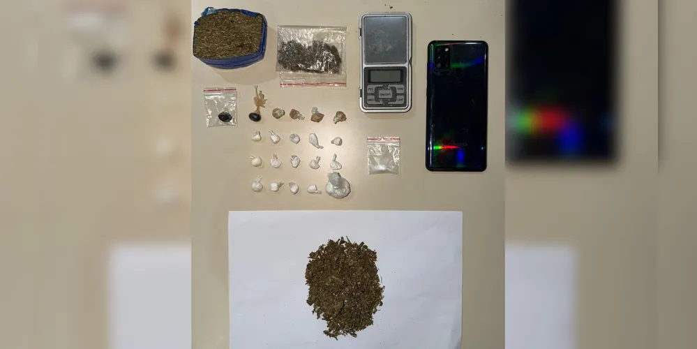 - Ocorrência resultou na apreensão de diferentes drogas, celular e balança de precisão.