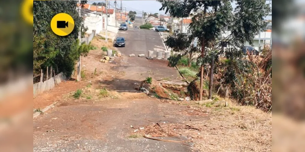 Moradores exigem uma solução imediata para uma cratera que está consumindo a rua Professora Júlia Carneiro Rosas, na região do Jardim Gianna, em Ponta Grossa. O grande buraco está aumentando e este trecho da via segue interditado. O problema se arrasta por sete anos e até o momento nada foi feito por parte da Prefeitura.