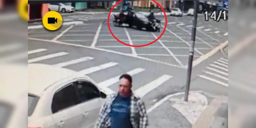 Uma colisão envolvendo um automóvel e duas motos deixou uma pessoa com ferimentos moderados. O acidente aconteceu na esquina da Avenida Balduíno Taques com a Rua Saldanha Marinho e foi registrado por câmeras de segurança na manhã deste sábado (14).