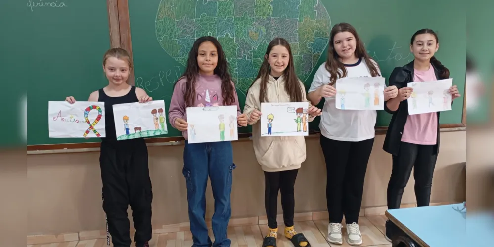 O quinto ano A da Escola Municipal São José, em Rebouças, da professora Vera Lucia Martins, desenvolveu uma atividade sobre o Abril Azul. A docente explica que a temática foi alvo de diversos trabalhos, com amplo debate na turma sobre a conscientização em relação ao autismo.