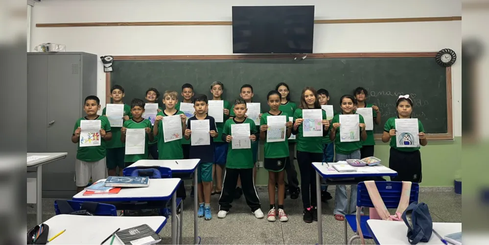 O quinto ano B da Escola Municipal do Jardim Tangará, em Imbituva, da professora Janaina Ribeiro, desenvolveu uma atividade voltada à produção textual, em sintonia com o projeto Vamos Ler. A docente explica que o trabalho foi realizado de forma individual, na qual cada aluno utilizou sua criatividade para elaborar um texto com estrutura completa: início, meio e fim.
